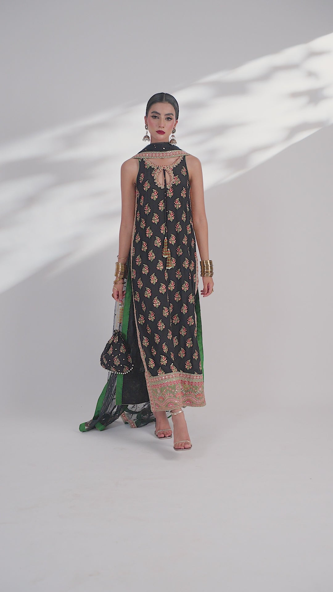 A black net dupatta, lightly embroidered and kissed with a subtle shine, tying the look together with refined elegance.