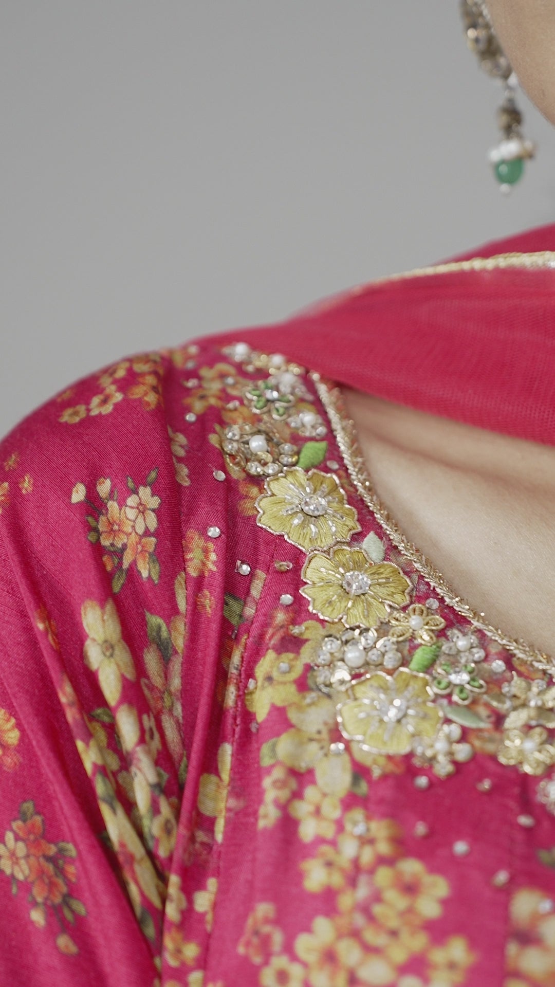This glamorous, beautifully paneled kaalidar is a masterpiece of intricate detailing and rich color. The long neckline is exquisitely embroidered in varying shades of lemon and hand-embellished with crystals, beads, sequins, dabka, and naqshi, creating a subtle yet stunning sparkle. It is further adorned with tiny floral clusters, adding a seamless flow of elegance around the neckline.The sleeves are finished with delicate gota lines, complementing the dress and adding a romantic touch. The matching net dupatta features a beautifully detailed border along the sides, enhancing the overall sophistication of the look.What makes this kaalidar truly special is, it's made in a 10 yard fabric, which allows for a graceful flare and flow that is wonderfully feminine.This ensemble exudes both grandeur and grace, making it the perfect choice for any special occasion.size chart Reha kaalidar