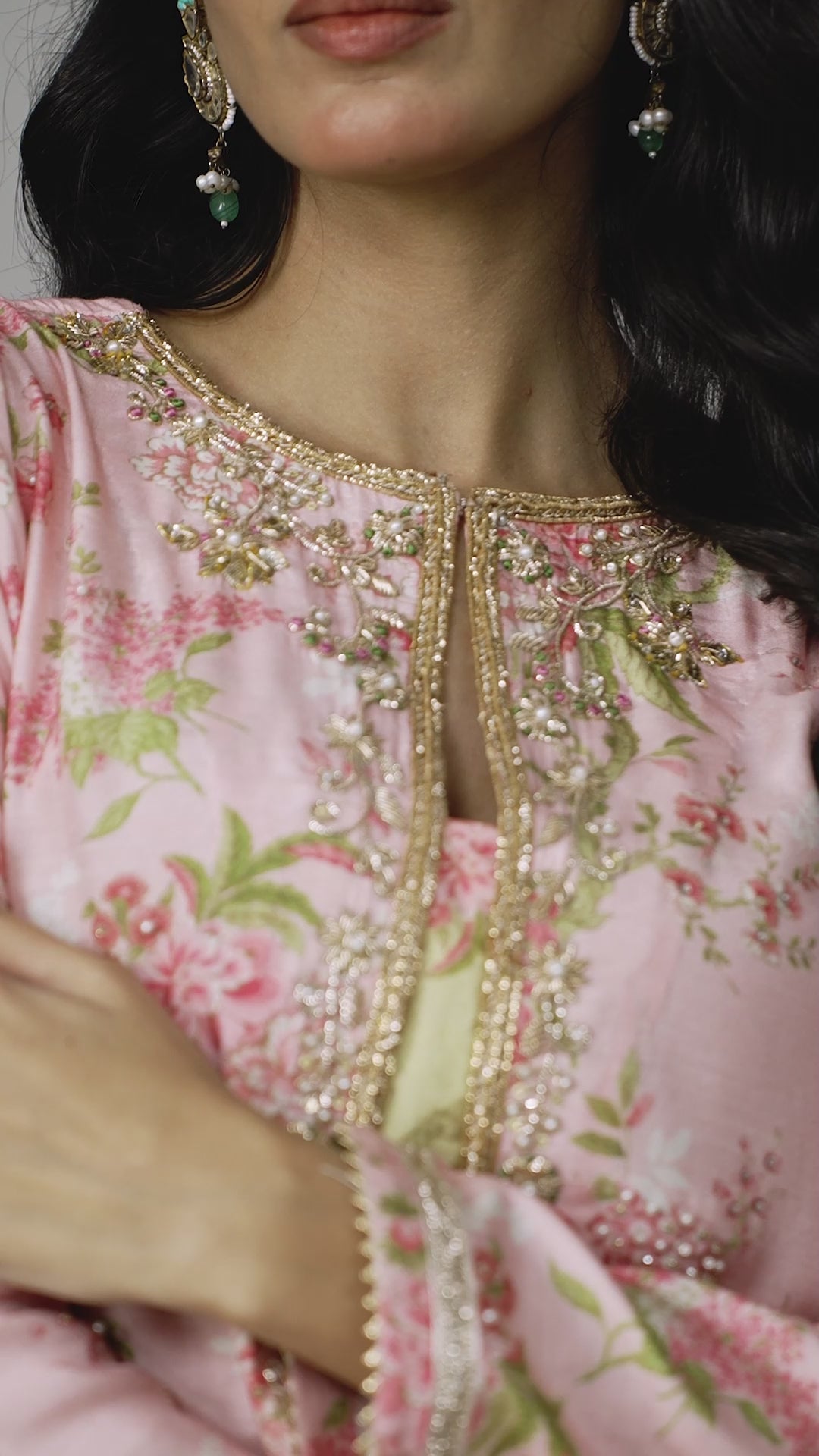 Maria Ali presents yet another collection of distinctly signature prints that will have you reaching for them time and again. The shirt, set on a soft blush pink canvas, is adorned with fresh floral prints in shades of pink, lavender, and green, incorporating botanical elements that add depth and richness to the design.The relaxed, much-loved silhouette features a flattering neckline, beautifully embellished with hand-crafted floral motifs made from dabka, zardozi, pearls, and sequins. The sleeves are exquisitely trimmed with gota, elevating the overall elegance of the piece—making it an ultimate must-have!Paired with contrasting green culottes, the outfit achieves a chic, balanced look that’s perfect for both day and night. Completing the ensemble is a stunning two-tone organza dupatta, adding grace and sophistication.This dress exudes timeless elegance, making it a must-have addition to your Eid wardrobe