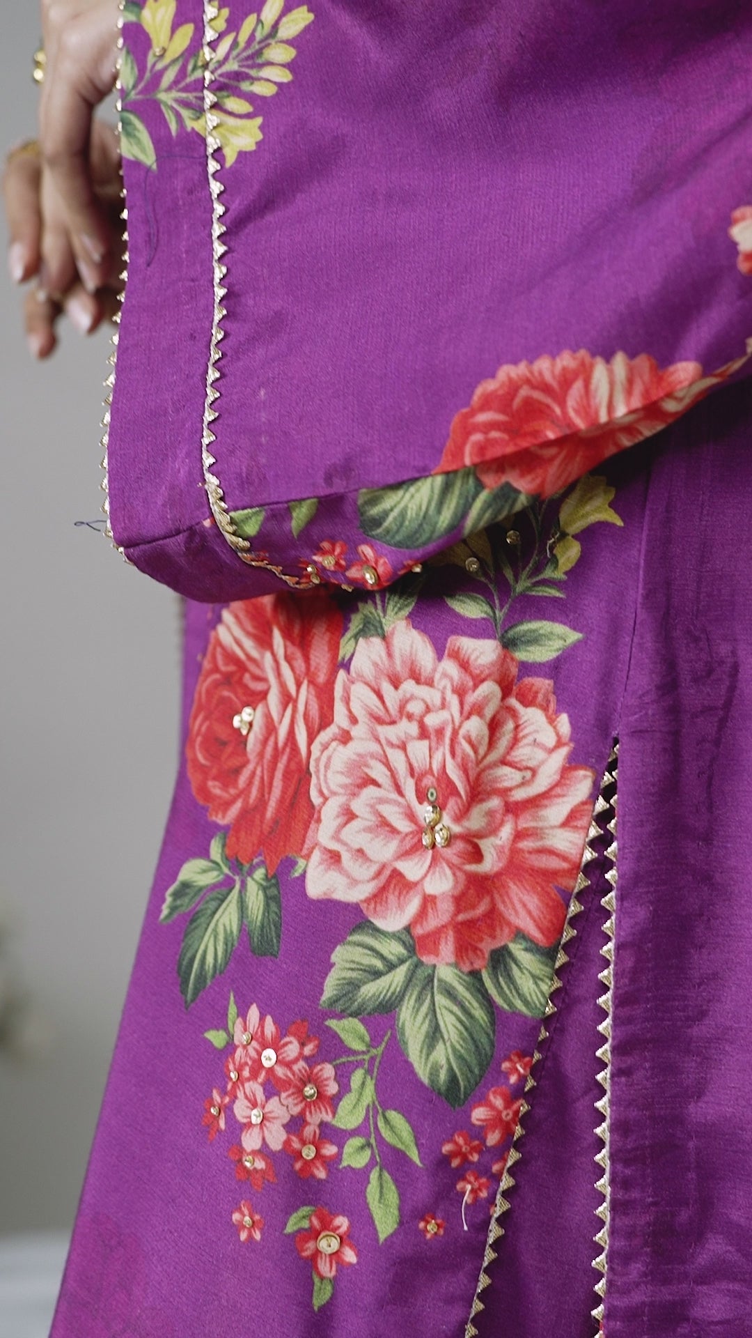 A canvas of deep purple adorned with a glamorous print, this outfit is ultra-comfortable and effortlessly wearable. The universally flattering neckline is beautifully adorned with delicately hand-worked, stylized floral patti and buttons. The flowing silhouette is further enhanced by handcrafted sequin embellishments, ensuring it catches the eye from every angle. The long hem and boxy sleeves are trimmed with exquisite gota edging, adding a touch of elegance.An uber-cool and unique piece, it’s perfect for when you want to be both laidback and ultra-stylish at the same time—just ideal for Eid! Please note, this dress does not come with a dupatta, but it can be ordered separately. The dupatta will be made from plain net with gota finishing to match the shirt’s design.