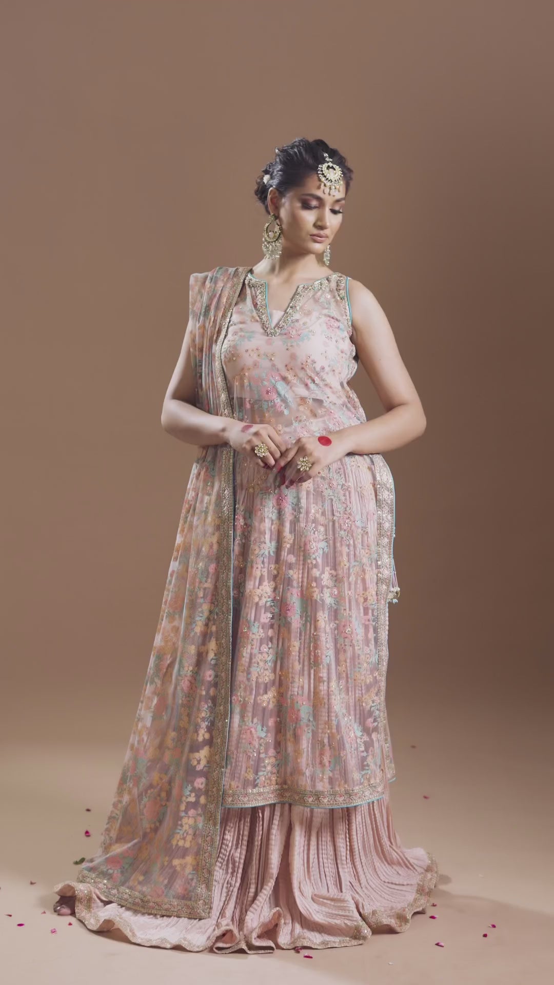 A delicate pastel hue screen printed peach halter net shirt enhanced with hand embellished neckline and all over spray using dabka, naqshi, baitki, beads etc. with addition of our signature chaand baali exaggerated tassels hanging in shirt’s seams sparkling its beauty even more. This outfit is paired with a plain bustier underneath, and a flowy crushed lehnga with beautiful pastel tone multi-colored embroidered border all round its flare. This set is completed with a matching screen-printed peach net dupatta, finished with intricately embroidered borders on all sides.