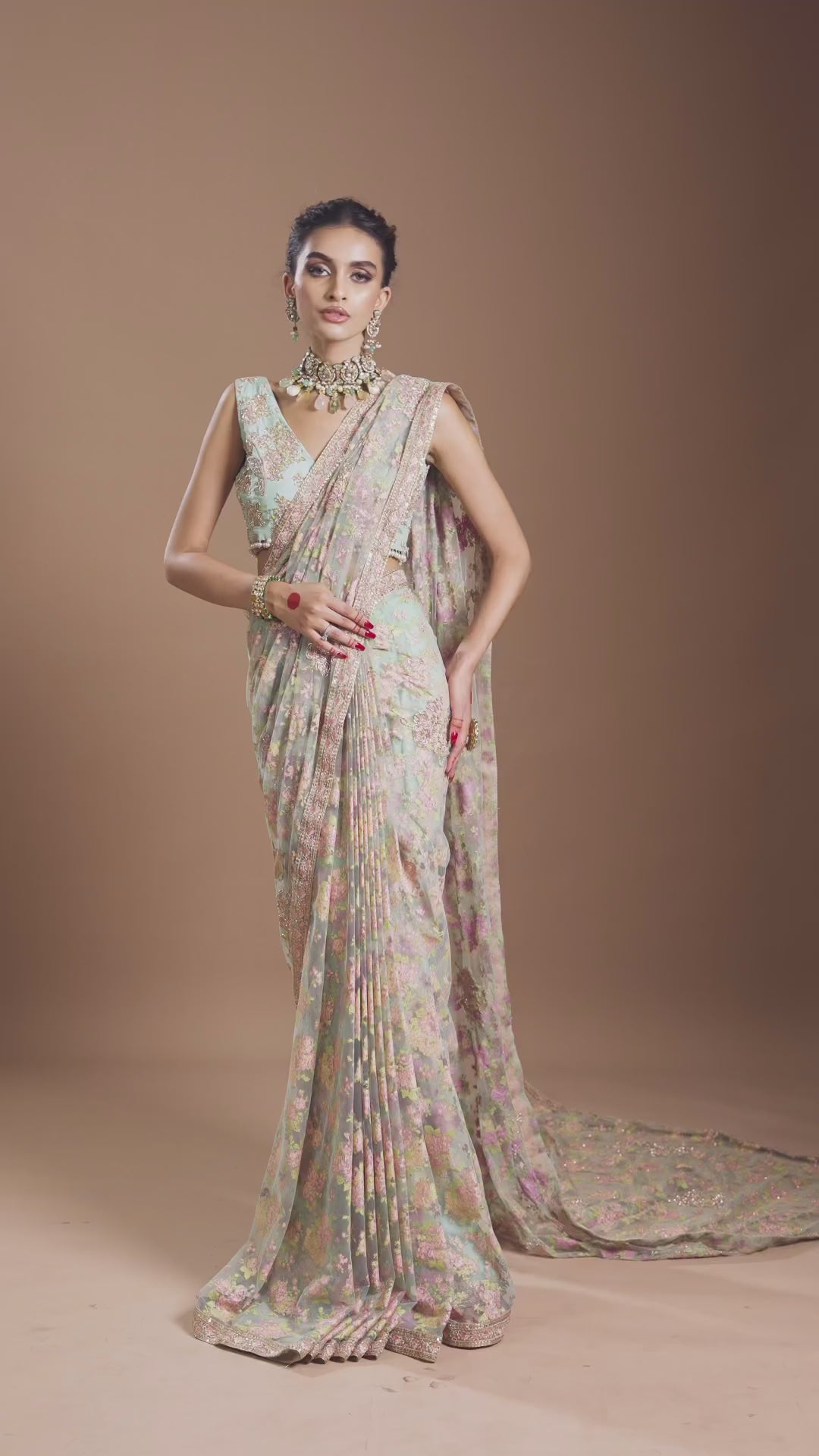 A spectacular pastel hue mint green screen printed net sarree embellished with all over naqshi work, finished with beautiful pastel tone multi-colored embroidered border all round, giving it a beautiful blingy look. Paired with a plain peti coat and screen printed blouse with same blingy naqshi work with addition of pearl hangings all over its waist.