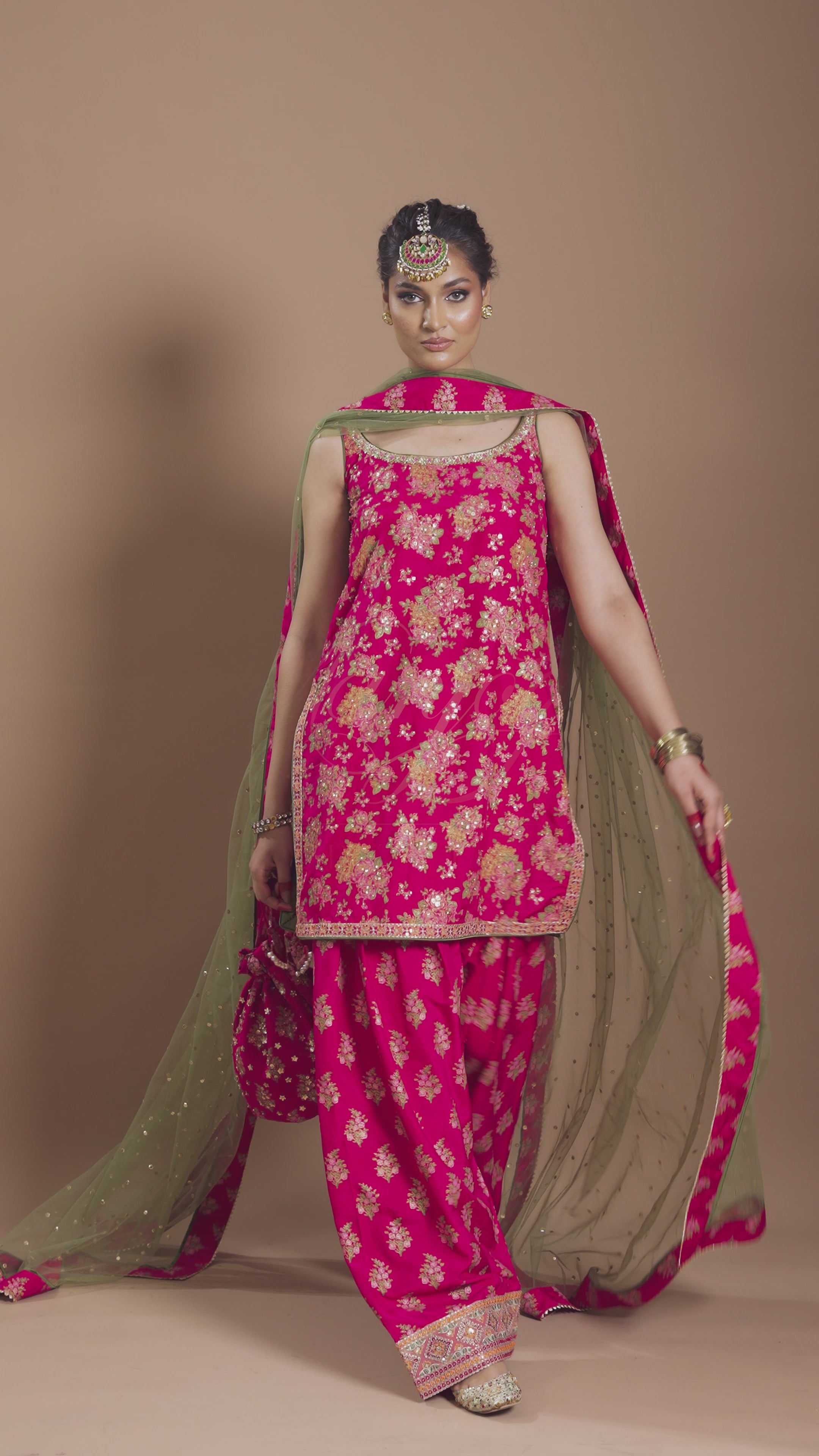 An adorable Shocking pink traditional screen printed ensemble with all over hand embellishment on its neckline, front and sleeves using dabka, naqshi, sequins, beads and resham work, finished with embroidered borders multiplying its beauty. This short shirt is paired with a screen printed traditional shalwar with an intricately embroidered sequin border on its bottom and a heavily sequin sprayed olive green net dupatta with contrast shocking pink printed edgings and kingri lace all around the dupatta.