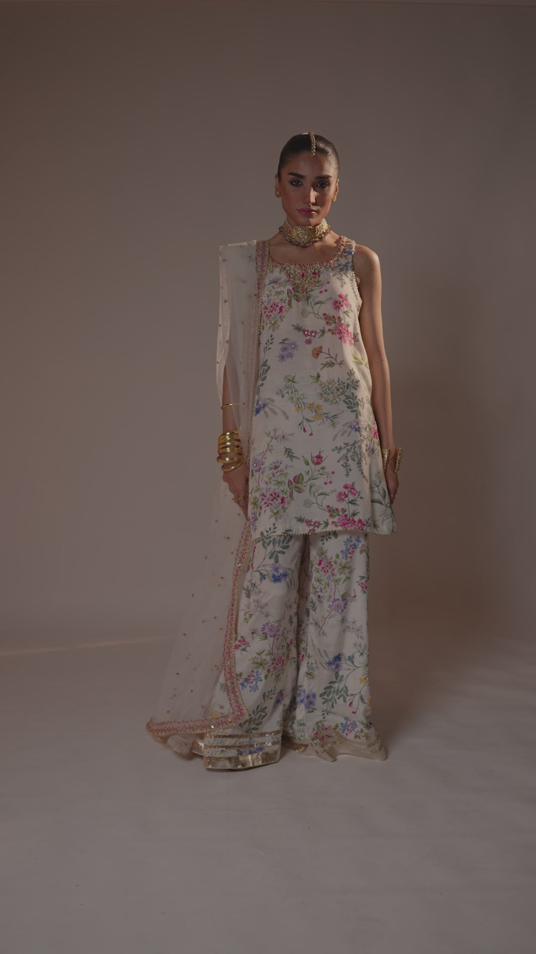 Paired with a flowing printed A-line sharara detailed with traditional lappas and a dupatta finished with multi-coloured embroidered borders and handcrafted tassels, Noor moves with effortless grace. Ideal for Eid gatherings and formal celebrations, Noor is timeless, elegant, and celebratory.