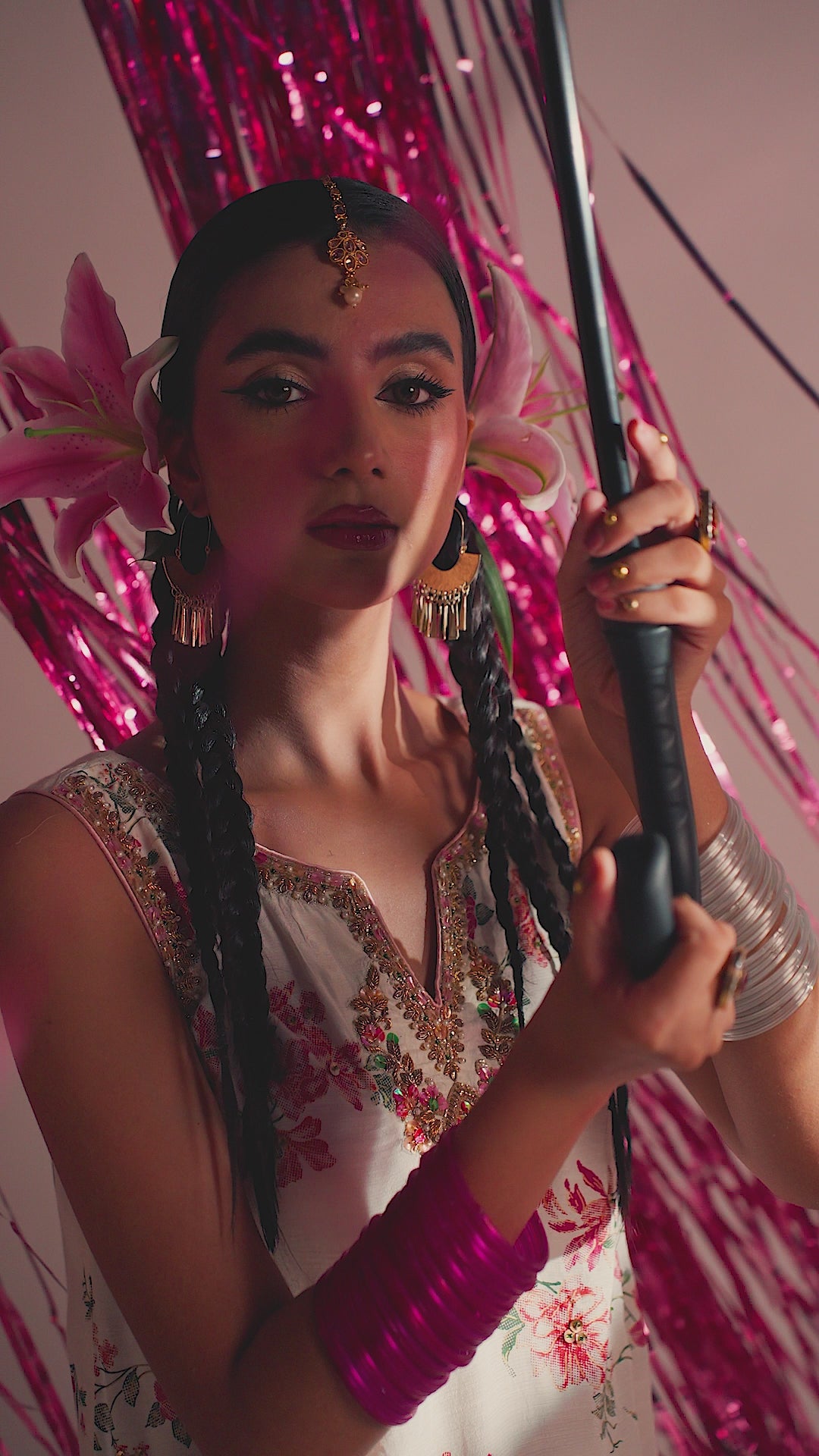 Presenting Mahi, an exquisite ivory traditional ensemble adorned with delicate floral screen prints that evoke timeless grace. The short shirt is richly embellished with intricate handcrafted details on the neckline, front, and sleeves—featuring masterful dabka, naqshi, sequins, beads, and resham work that add depth and shimmer.