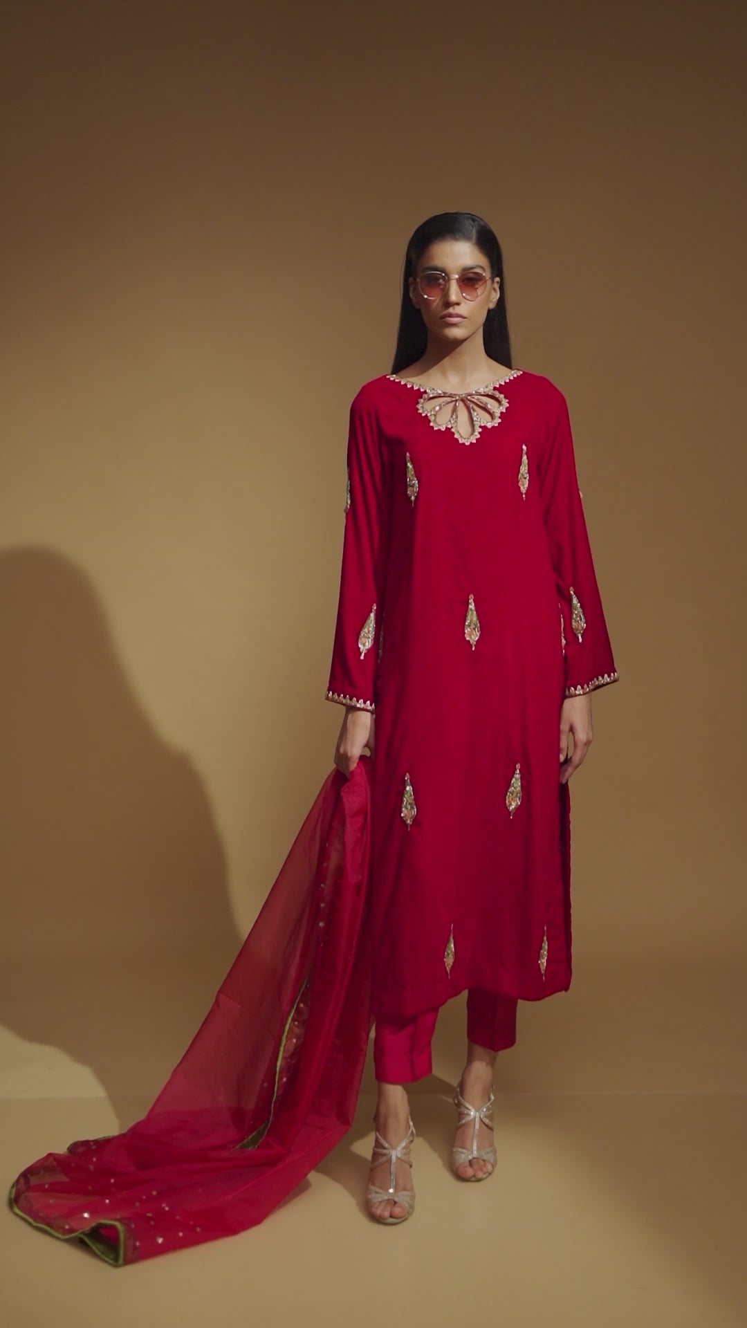 A beautifully front-back hand crafted long shirt with an elegant neckline, paired with straight rawsilk trousers & floral sequins four sides dupatta border.