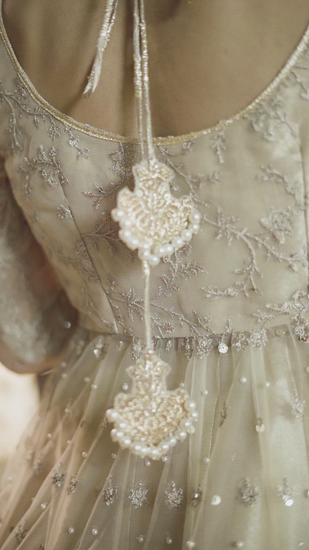 A classic combination of 16 paneled gold net pishwas combined with a 14 paneled pure masuri tissue lehnga and a four sided bordered dupatta Ooph the dress. This gold pishwas by Maria Ali is a pure luxury adorned with dainty hand embellishments over net, Which exudes a uniquely festive feel perfect to bring elegance and sophistication into your wedding season wardrobe.
