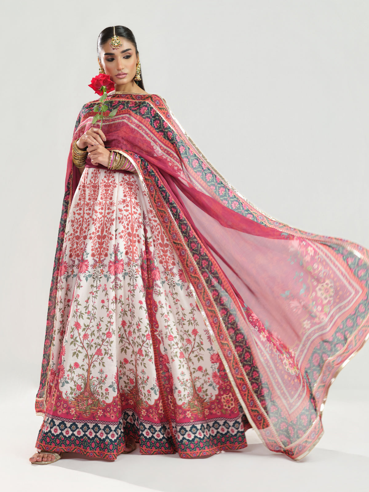 A traditional yet modern Gharara set with prepossessing gold zardori hand embellishment all over shirt’s front and sleeves with finesse, enhancing the beauty & charm of its digital print, completed with delicate gold finishings and our statement chaand bali tassels. This impressive dress is paired with a net dupatta with lappa and beautiful multi coloured edgings. A versatile ensemble that can be worn on different occasions.