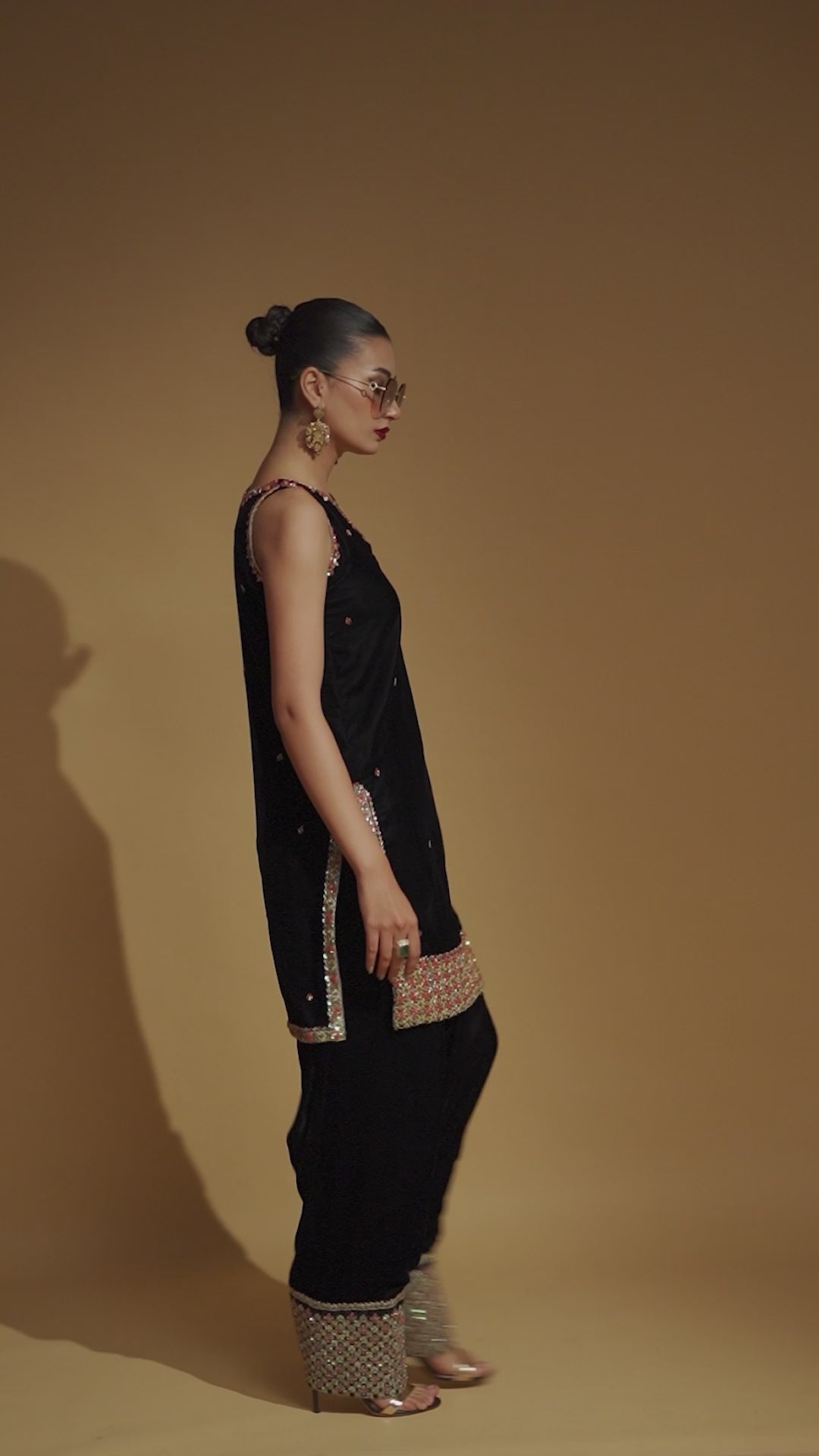 A Classy black halter shirt with a beautiful front-back neckline, an embellished colorful border on its shirt, paired with a heavily embellished shalwar & sequins sprayed dupatta with golden tissue finishings on four sides. This outfit by Maria Ali is a perfect combination of classy and modern touch.