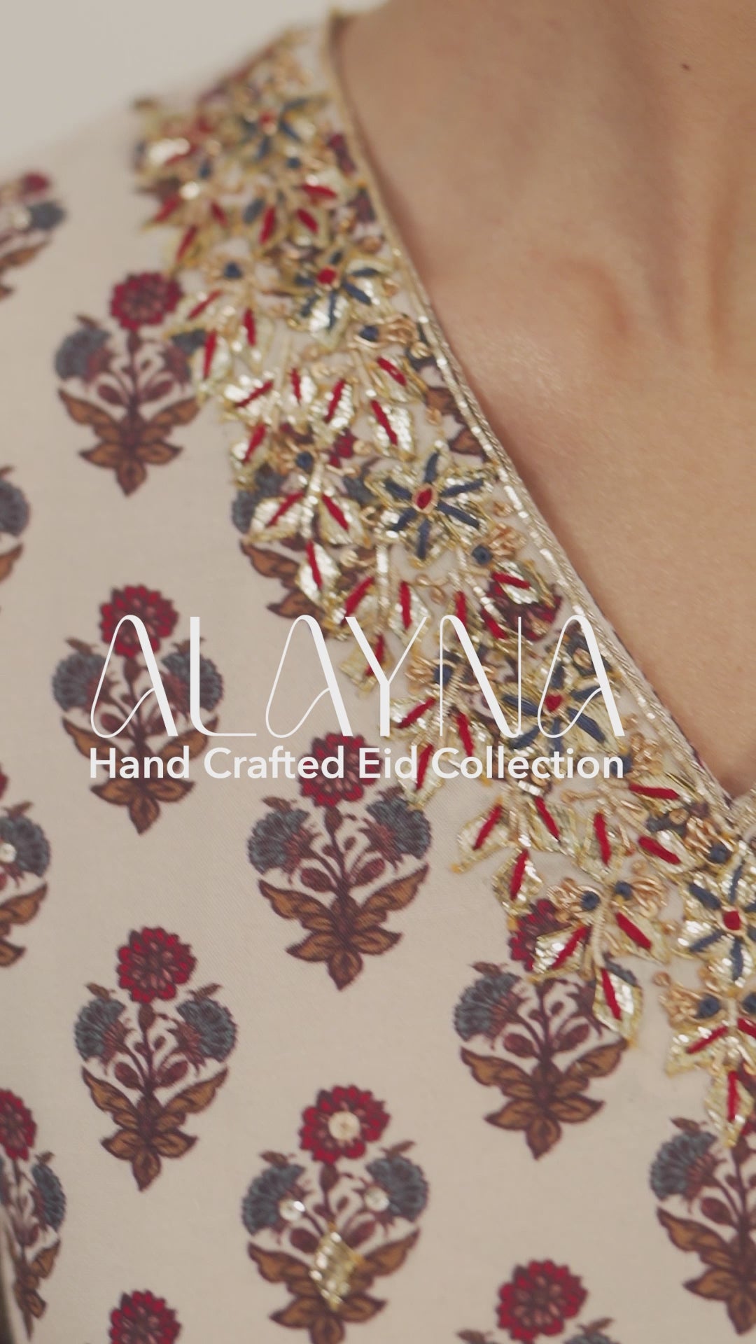 An astonishing & classy ivory digital printed shirt with heavily embellished gota and zardozi worked neckline paired with an Aazar pants with self lappa edgings and a bewildering contrast net gota dupatta. This pair speaks volume about its uniqueness and can be carried out with style keeping the traditional touch in considerations.